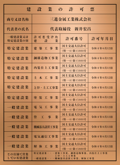 三進金属工業では、業務を行うにあたり、会社として様々な資格を有しています。