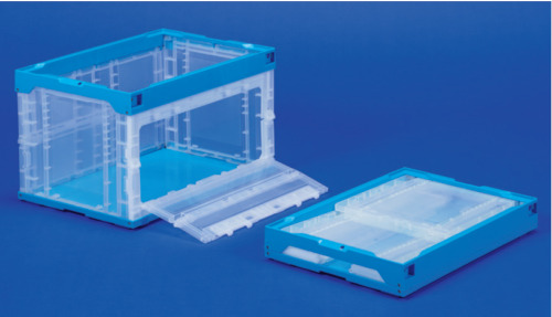 側面が透明で内容物の確認が一目でできる折り畳みコンテナは、側面の扉により段積みした状態で内容物を取り出すことができます。