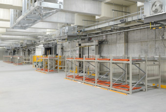 広いフロアに大量のパレットを保管したいが、天井高が低い。この課題をクリアしたのが超高密度収納を可能にするプッシュバックラックです。